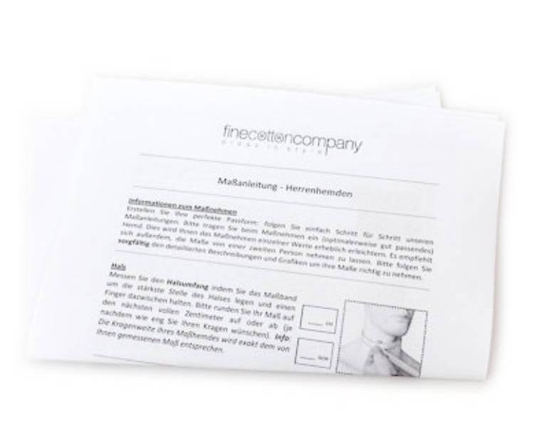 Per Post erhalten Sie umgehend ein Massband, unsere Massanleitung, sowie fünf Stoffproben unserer Topseller. So können Sie sich in aller Ruhe zu Hause vermessen, und sich vor Ort ein Bild von der ausgezeichneten Qualität unserer feinen Baumwoll-Stoffe machen. Sollten Sie spezielle Stoffwünsche haben, schicken Sie uns diese bitte an info[@]finecotton.ch oder geben sie im Bemerkungsfeld bei der Bezahlung an (Bitte beachten Sie, dass wir momentan leider nicht alle Wünsche berücksichtigen können, da wir nicht alle Stoffproben vorrätig haben).